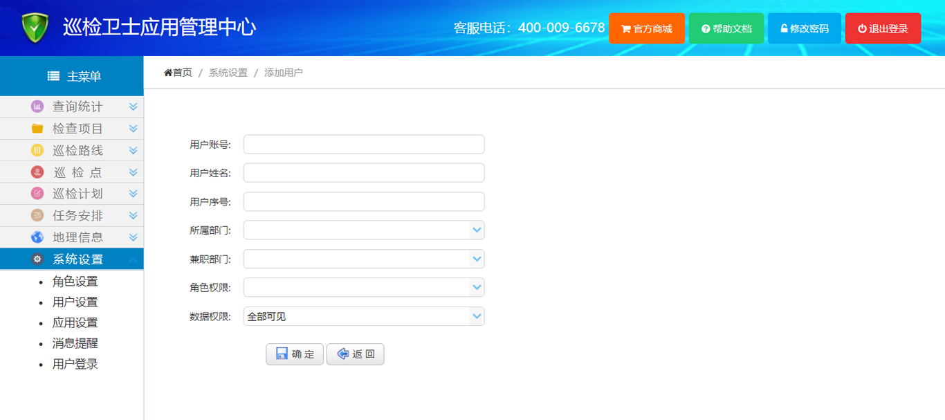 系统默认包含“管理员”、“巡检员”两种角色,普通用户请在“角色权限”下拉框中选择“巡检员”。