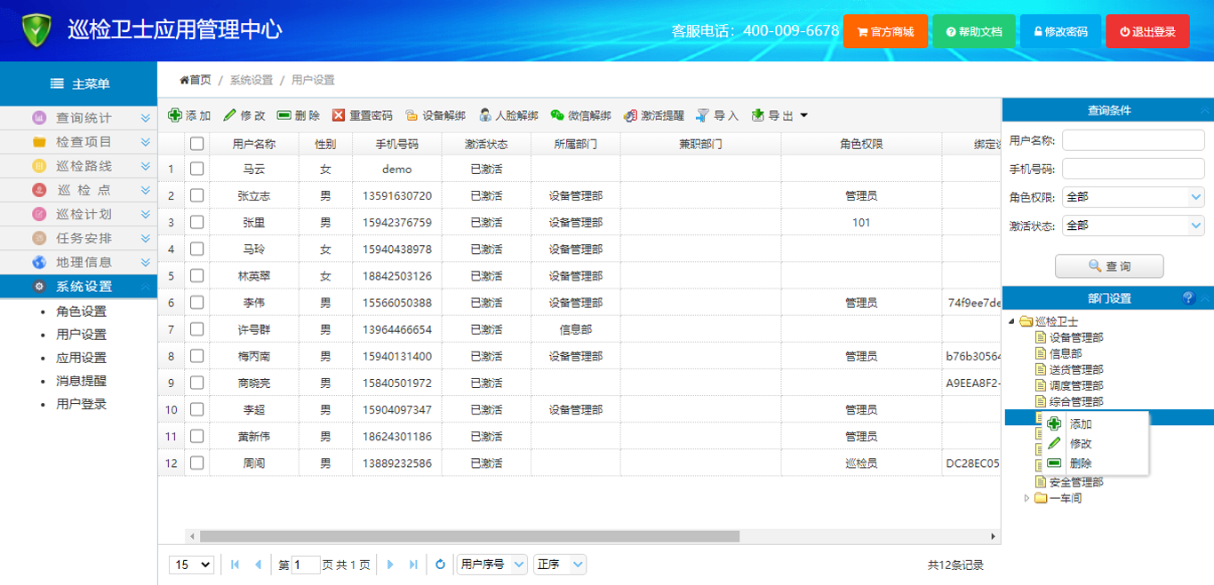巡检卫士是一个多部门、多人员共同使用的协同工作平台,应用注册人同时也是应用管理员,拥有应用内巡检内容的配置权限,可以对应用内的部门及人员进行维护管理,支持批量导入、导出功能。