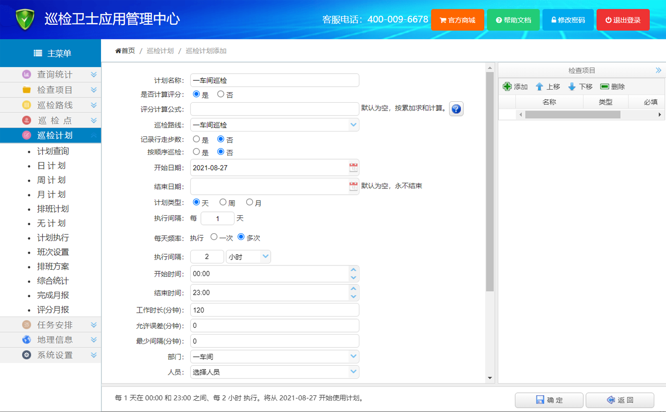 6、在左侧主菜单中点击 【巡检计划】,再点击【日计划】,进入巡检日计划设置页面,新建一个计划,计划名称输入框填写“一车间巡检”,巡检路线选择“一车间巡检”,每天频率选择“多次”,执行间隔“2”小时,开始时间“00:00”,结束时间“23:00”,工作时长“120”分钟,部门选择“一车间”,最后点击【确定】按钮。