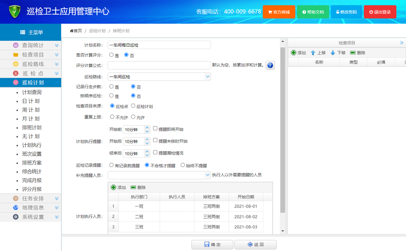 7、在左侧主菜单中点击 【巡检计划】,再点击【排班计划】,进入排班计划设置页面,工具栏上点击【添加】,新建一个计划,计划名称输入框填写“一车间每日巡检”,巡检路线选择“一车间巡检”,计划执行人员中依次添加三班两倒排班方案的具体执行部门,方案中第一个班次的开始执行日期,最后点击【确定】按钮。