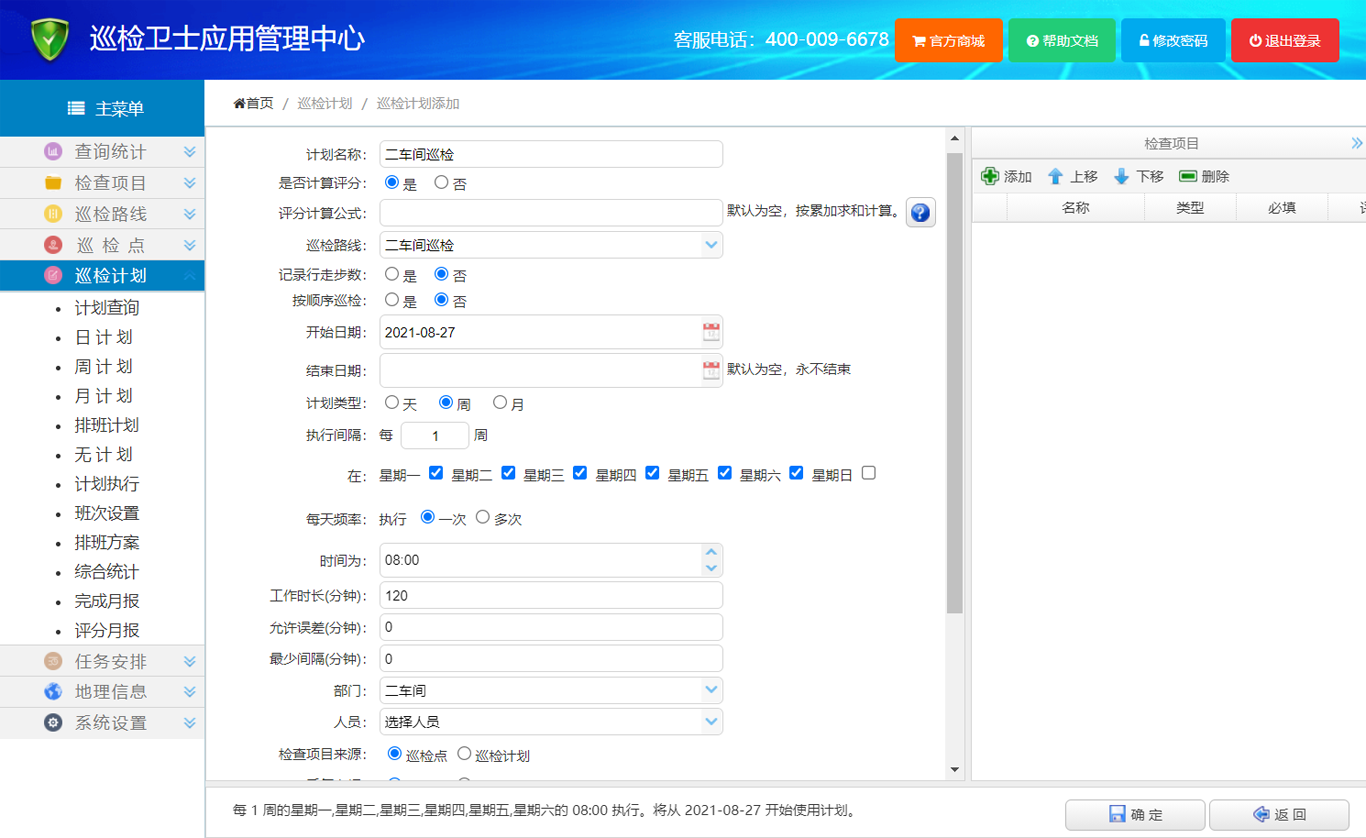 6、在左侧主菜单中点击 【巡检计划】,再点击【周计划】,进入巡检周计划设置页面,工具栏上点击【添加】,新建一个计划,计划名称输入框填写“二车间巡检”,巡检路线选择“二车间巡检”,在选择“星期一、星期二、星期三、星期四、星期五、星期六”,工作时长“120”分钟,部门选择“二车间”,最后点击【确定】按钮。