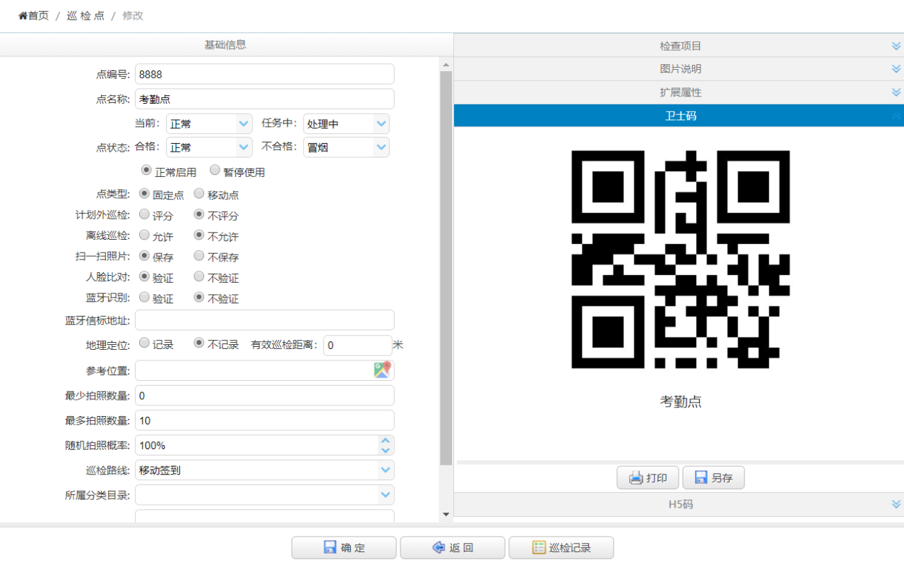 3、在左侧主菜单中点击 【巡检点】,再点击【点设置】,进入巡检点设置页面,工具栏上点击【添加】,输入点编号“8888”、点名称“考勤点”,人脸比对选择“验证”,巡检路线选择“移动考勤”,然后点击【确定】按钮。保存成功后鼠标左键双击该巡检点,进入巡检点修改页面,在右侧选项卡中选择“卫士码”,点击【打印】按钮,得到移动考勤二维码,将其粘贴到考勤点。人脸比对功能可以确保考勤人是本人操作,避免他人替代作假,另建议配合蓝牙信标使用,以确保考勤人必须在考勤点上操作,拍照保存考勤二维码无效。