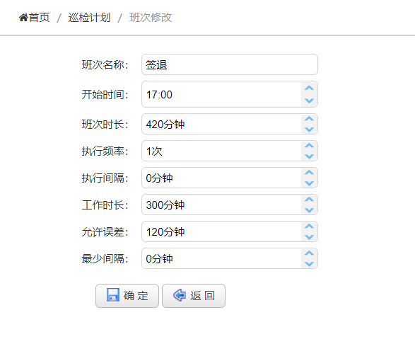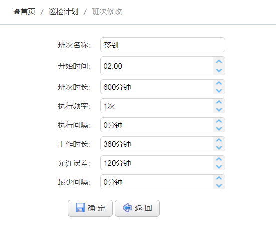 4、在左侧主菜单中点击【巡检计划】,再点击【班次设置】,进入巡检计划设置页面,工具栏上点击【添加】按钮,添加一个班次,班次名称填写“签到”,开始时间填写“02:00”,班次时长填写“600”分钟,执行频率“1”次,工作时长填写“360”分钟,允许误差填写“120”分钟,如下图所示,然后点击【确定】按钮,保存数据。