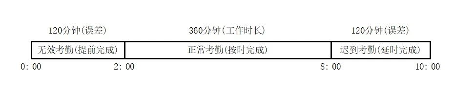 签到班次开始时间02:00,工作时长360分钟,即从2:00到8:00为按时完成签到考勤有效时间。误差120分钟,从8:00到10:00为延时完成考勤时间,此时间段扫码考勤在巡检卫士中执行状态计为延时完成,即迟到。从0:00到2:00为无效考勤时间,提醒员工不要在这个时间段扫码考勤,如果考勤则执行状态计为提前完成,多一次早退记录。