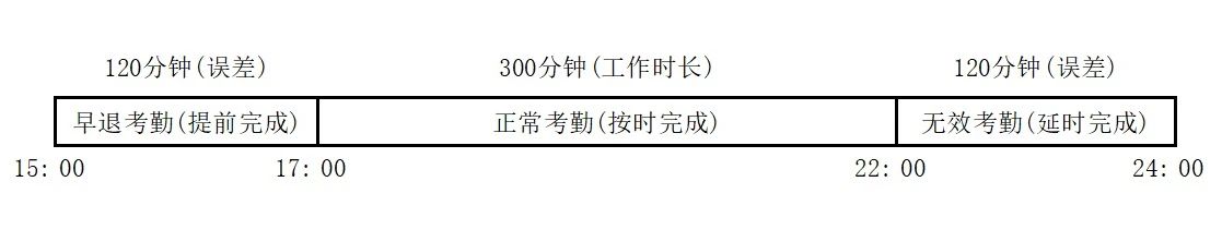 签退班次开始时间17:00,工作时长300分钟,即从17:00到22:00为按时完成签退考勤有效时间。误差120分钟,从15:00到17:00为提前完成考勤时间,此时间段扫码考勤在巡检卫士中执行状态计为提前完成,即早退。从22:00到24:00为无效考勤时间,提醒员工不要在这个时间段扫码考勤,如果考勤则执行状态计为延时完成,多一次迟到记录。