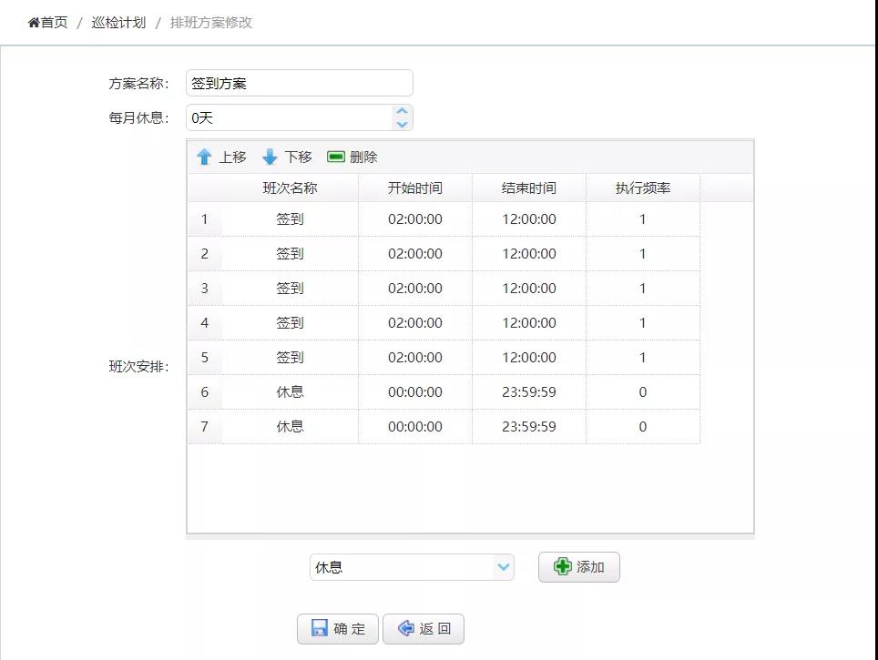 6、在左侧主菜单中点击【巡检计划】,再点击【排班方案】,进入排班方案设置页面,工具栏点击【添加】按钮,添加一个新方案,方案名称填写“签到方案”,班次安排中依次填写5个签到,2个休息日,如下图所示,然后点击【确定】按钮,保存数据。