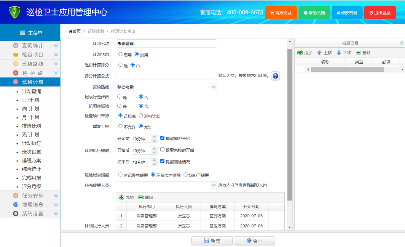 8、在左侧主菜单中点击 【巡检计划】,再点击【排班计划】,进入巡检排班计划设置页面,工具栏上点击【添加】,新建一个计划,计划名称输入框填写“考勤管理”,巡检路线选择“移动考勤”,计划执行人员中,为每个考勤人员添加一个签到方案、一个签退方案,开始日期选择排班方案中第一个班次的开始日期,最后点击【确定】按钮,保存数据。