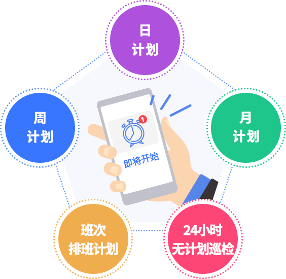 在巡检卫士中,提供了日计划、周计划、月计划、班次排班计划、24小时无计划五种计划设置方式;提供了即将开始、未按时开始、漏检提醒三种消息提醒功能。可满足任意工作场景的需要,并准确的将工作信息送达提醒人。